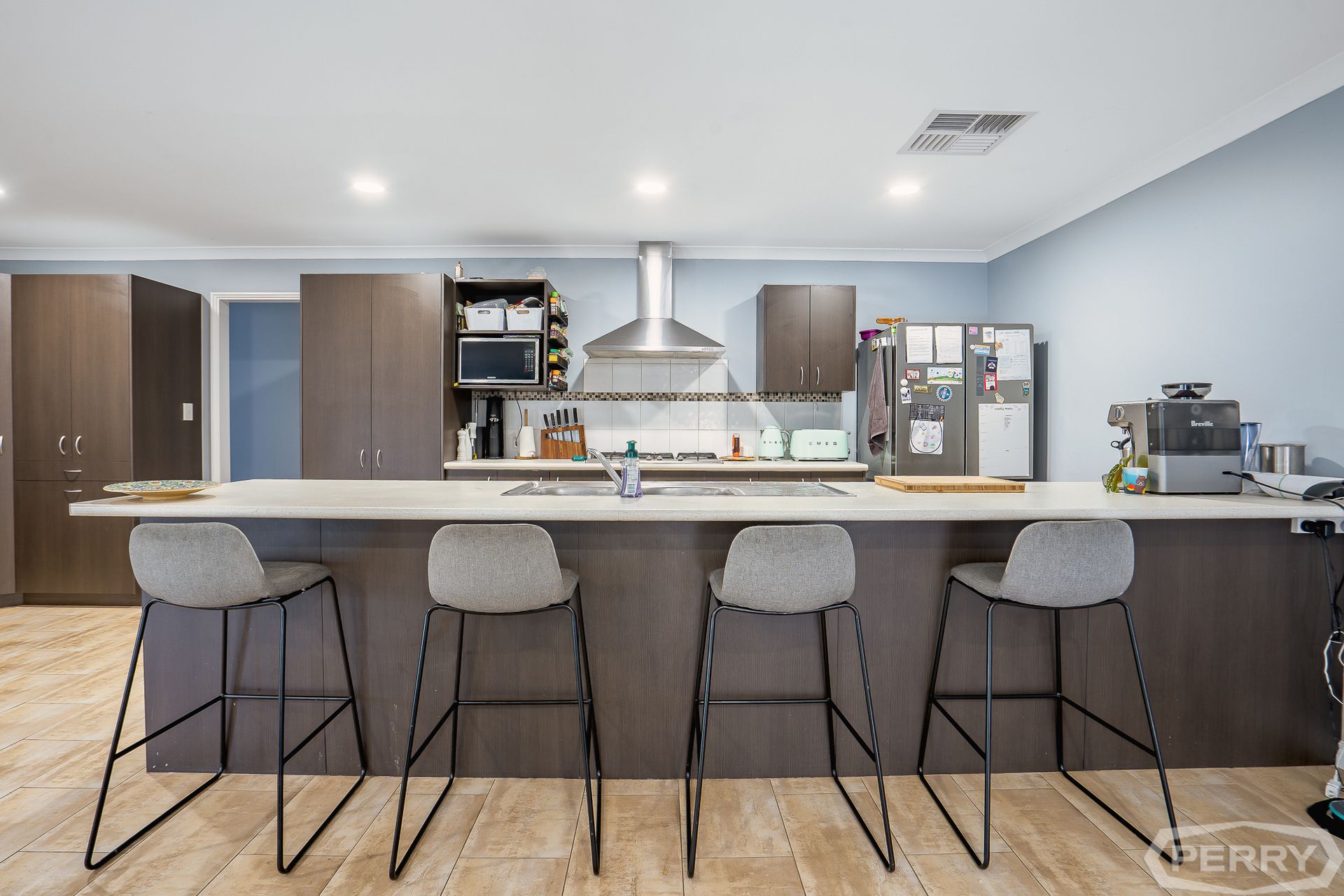 A creamy granite kitchen benchtop creates a striking island feature that looks sleek and sophisticated amongst the rich chocolate hue of the kitchen's cabinetry. Other enviable features include a double fridge recess, quality stainless steel appliances and a convenient corner pantry.