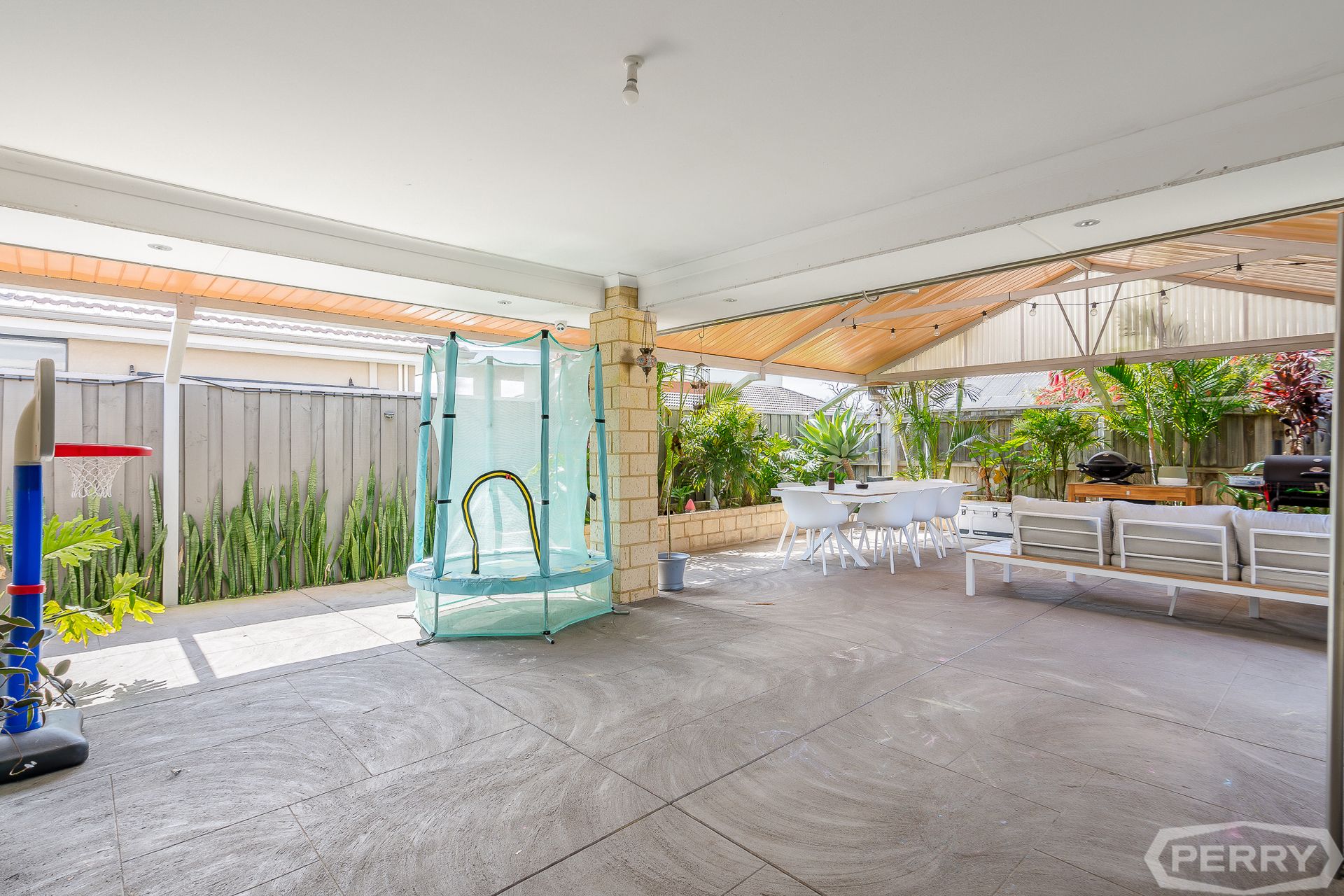 For year-round dining and entertaining, walk outdoors to a spacious and enclosed alfresco area, with stunning cedar-lined gable roof patio entertaining area.