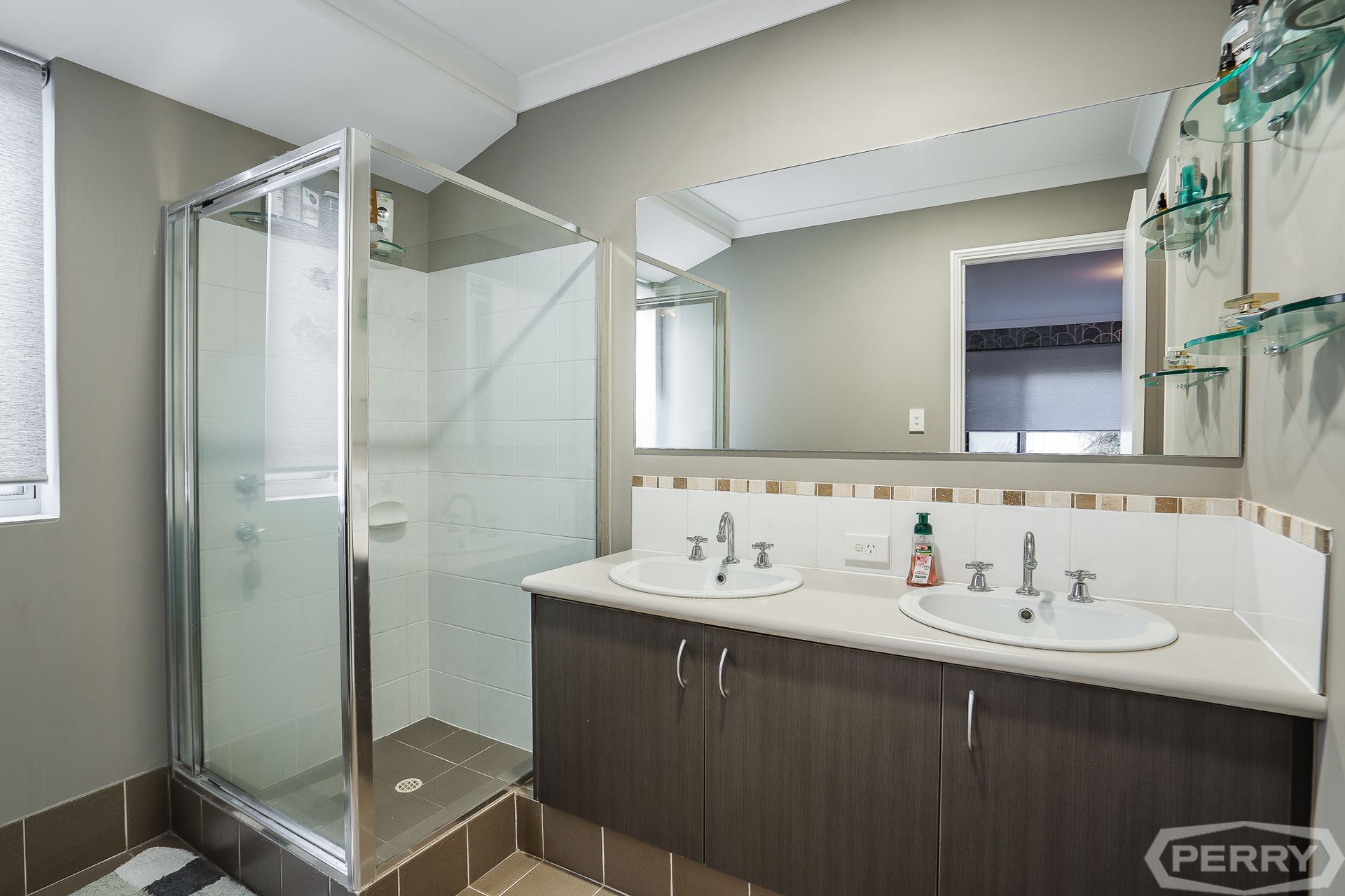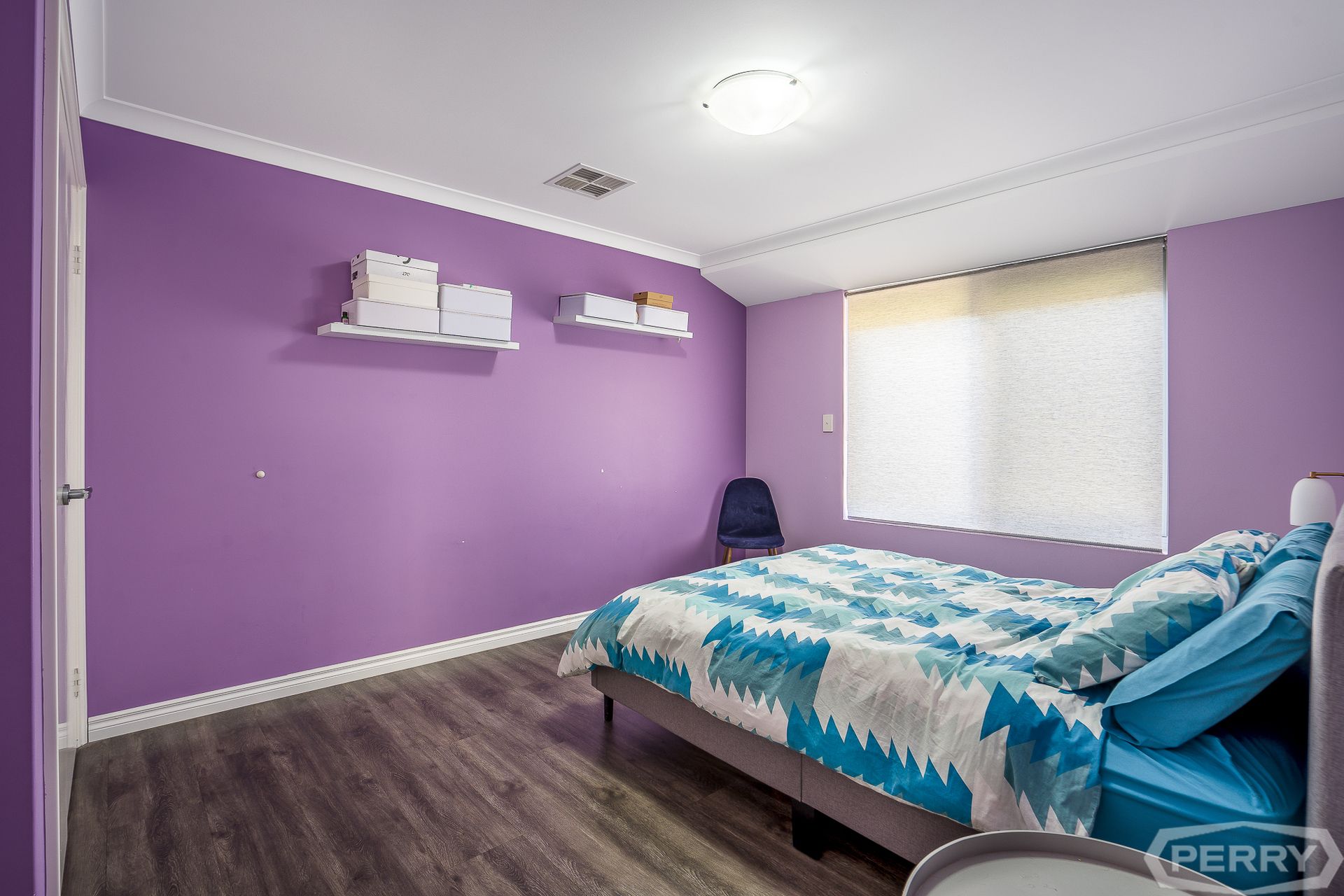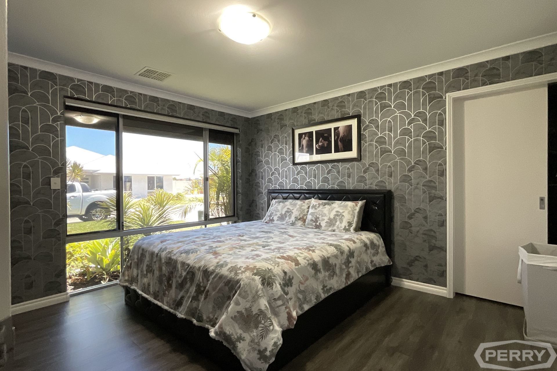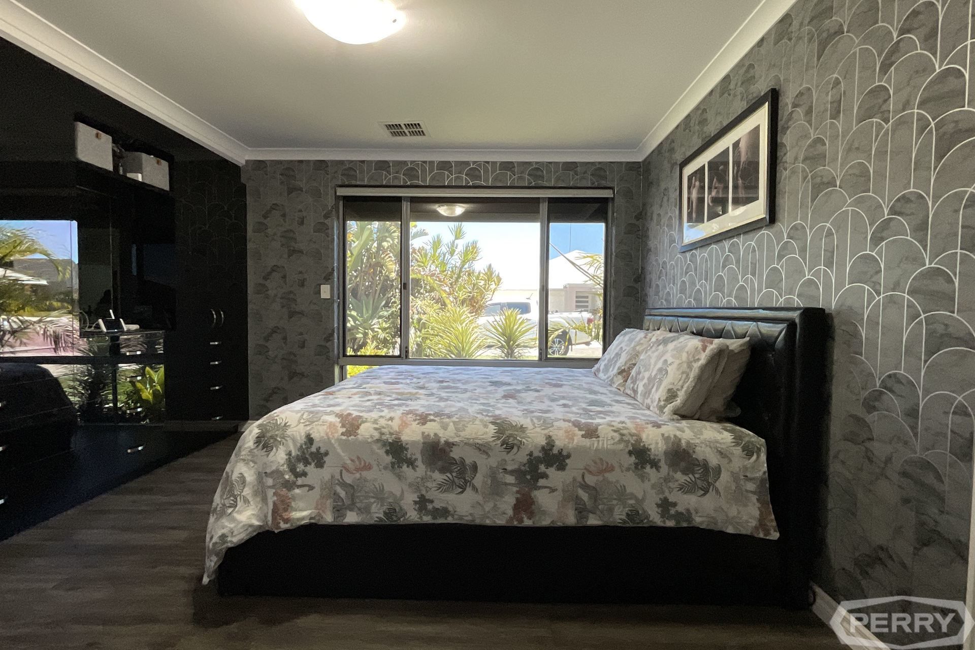 Step inside the chic, designer wallpapered master suite with dark timber veneer cabinetry, large walk-in wardrobe and luxurious ensuite bathroom with his-and-her vanity.