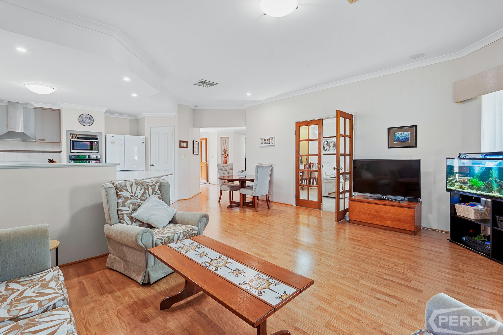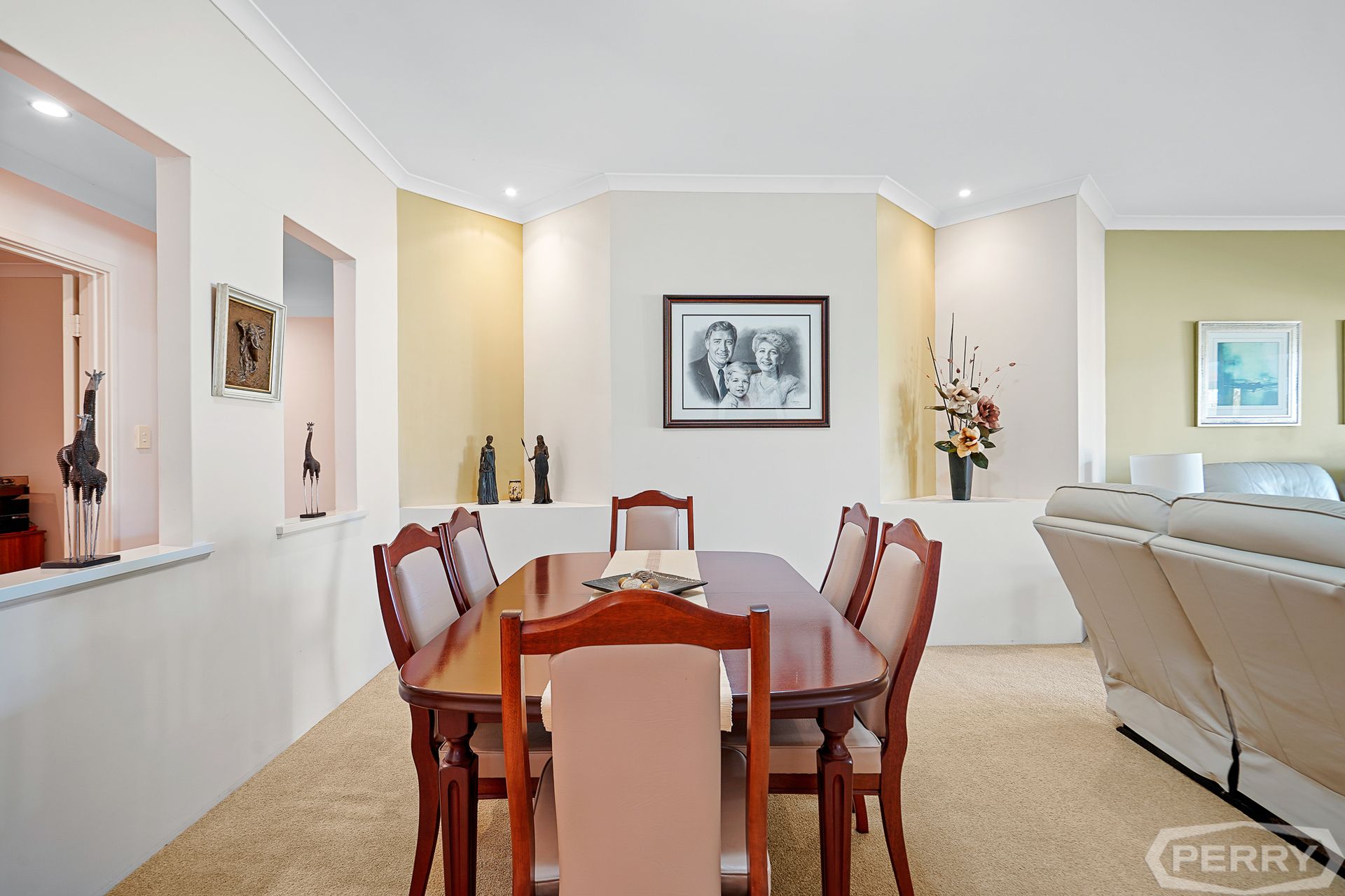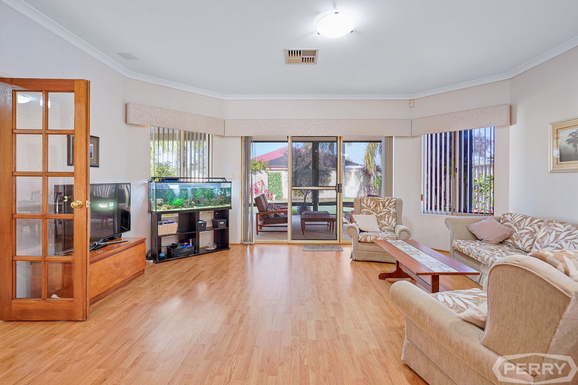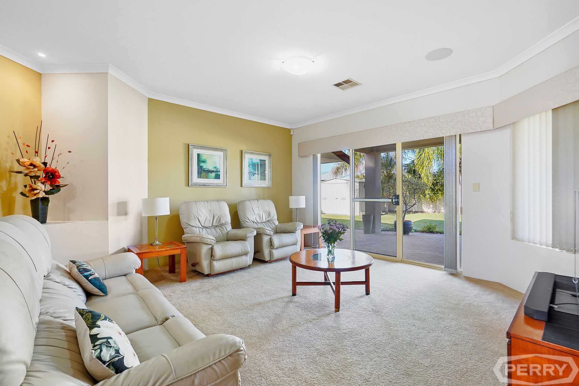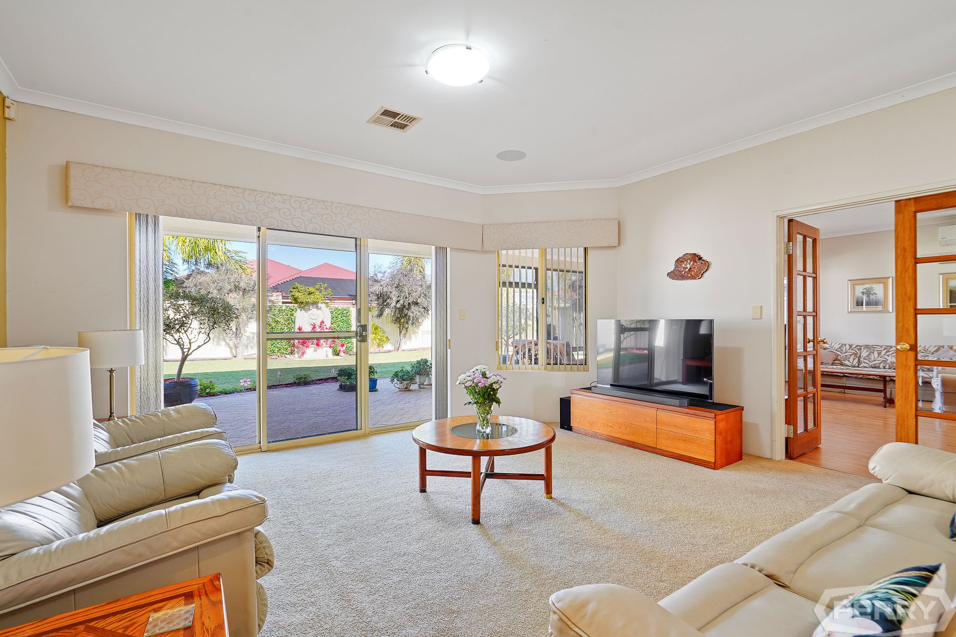 The formal carpeted lounge/theatre area has triple sliding Crimsafe doors overlooking the alfresco area and bore-water reticulated garden.