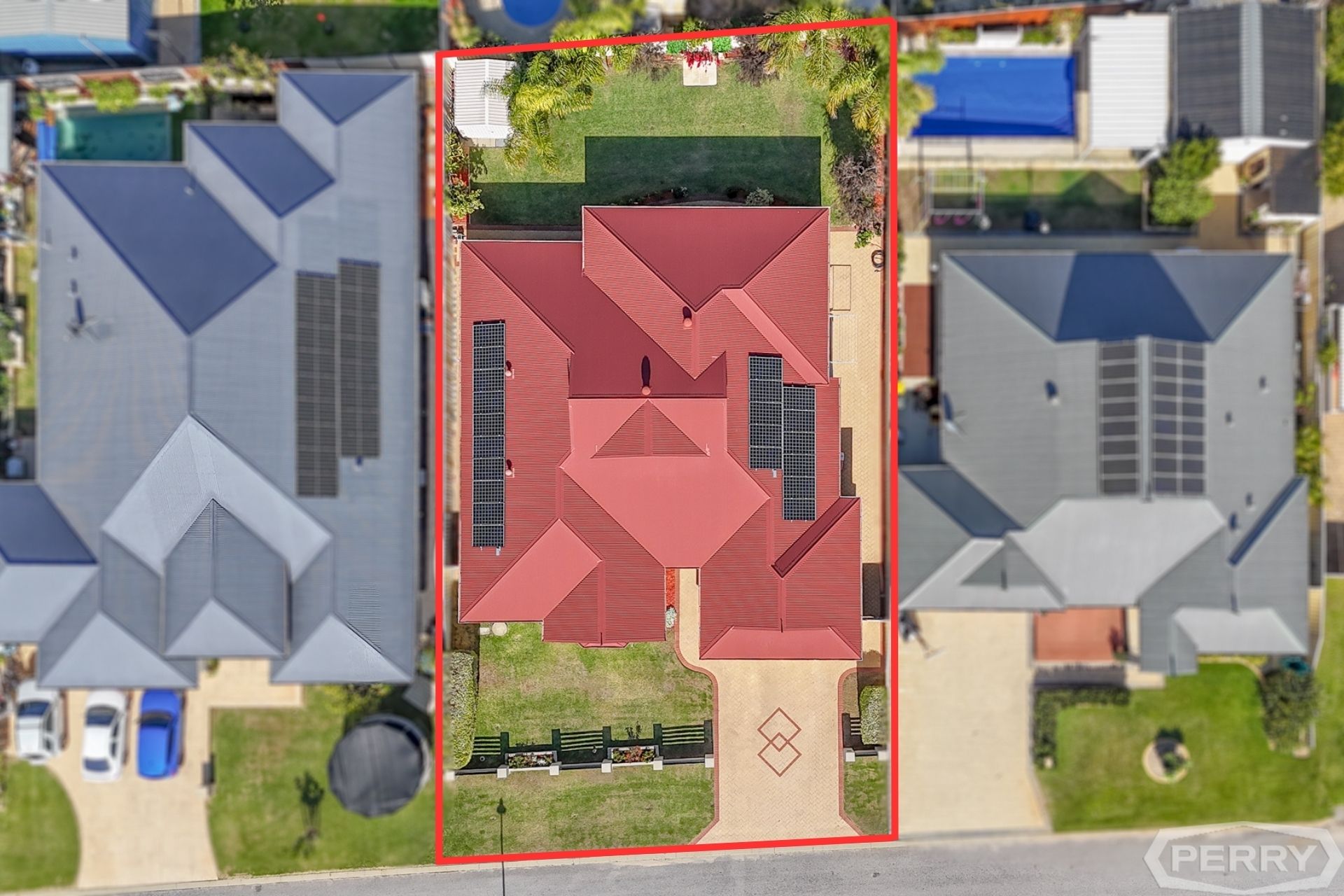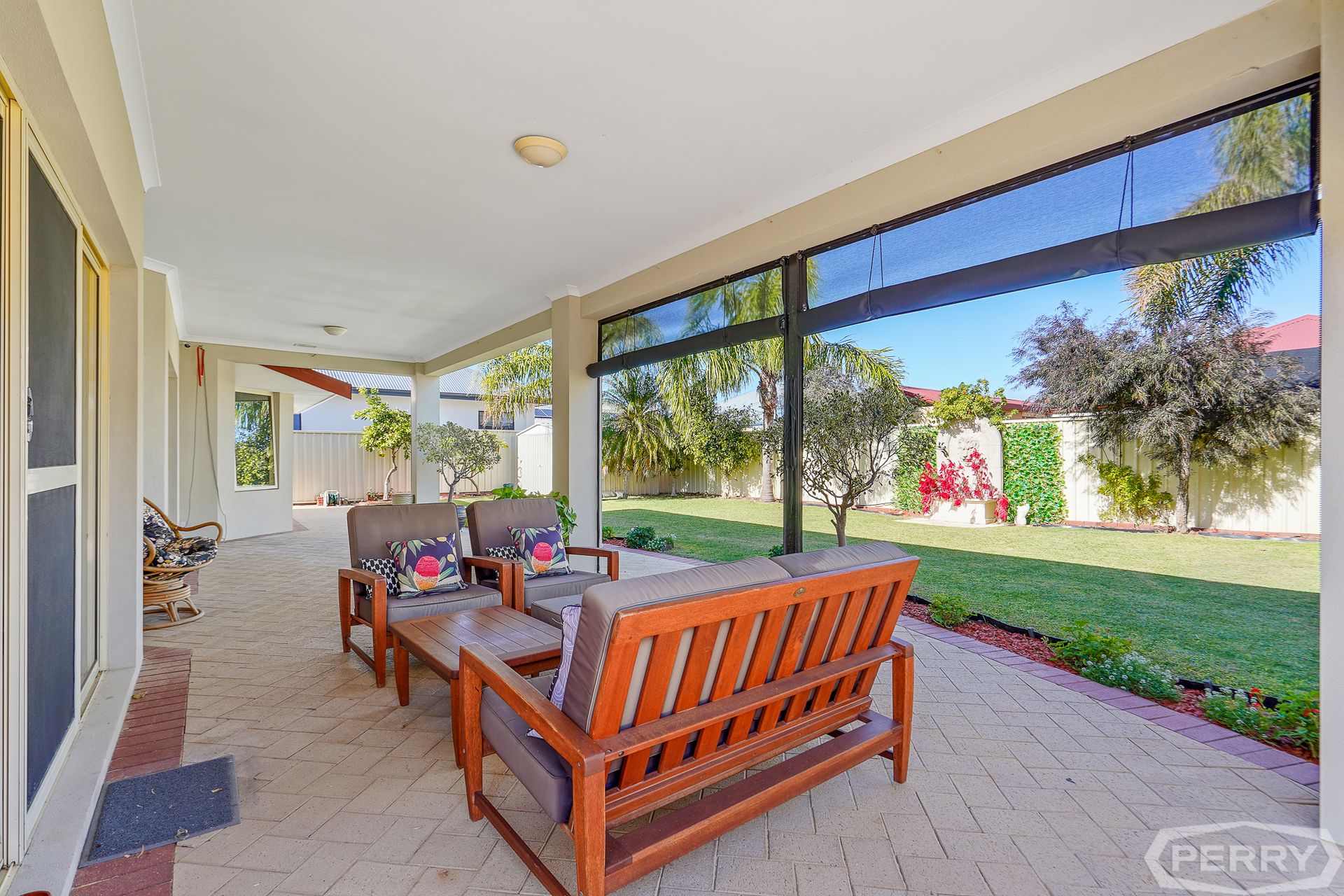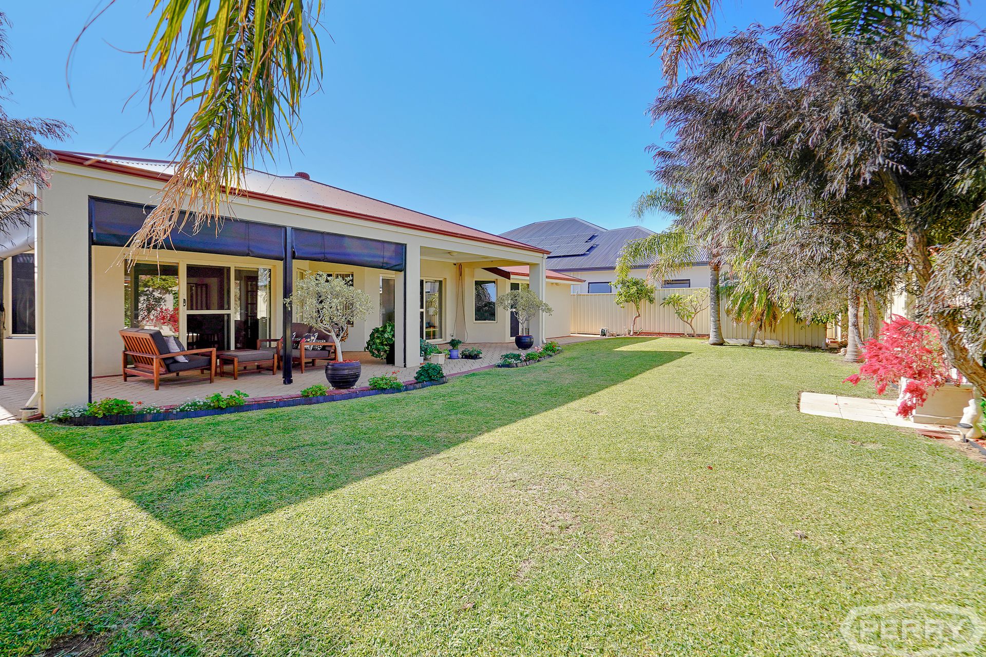 This is a huge, functional family home with a massive backyard and lush green lawns surrounding an outdoor entertaining area.