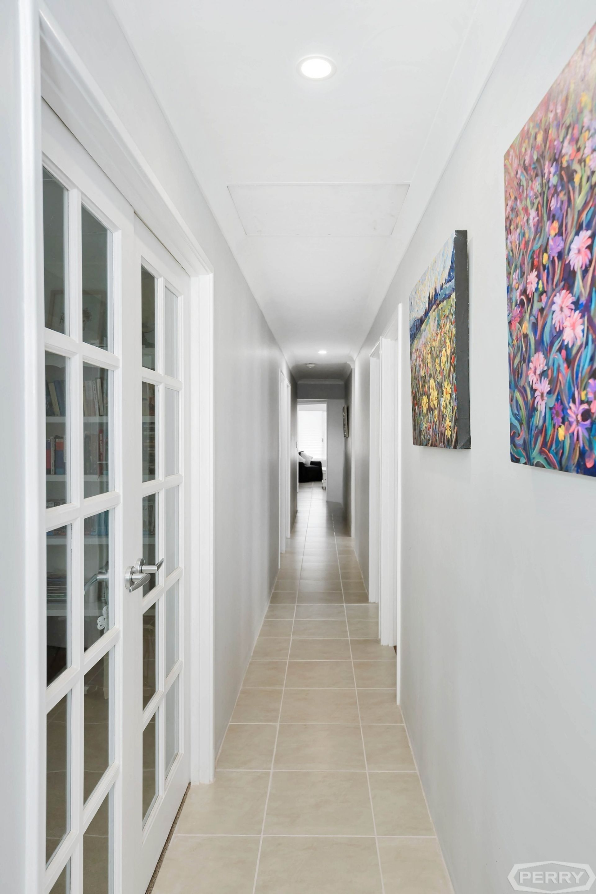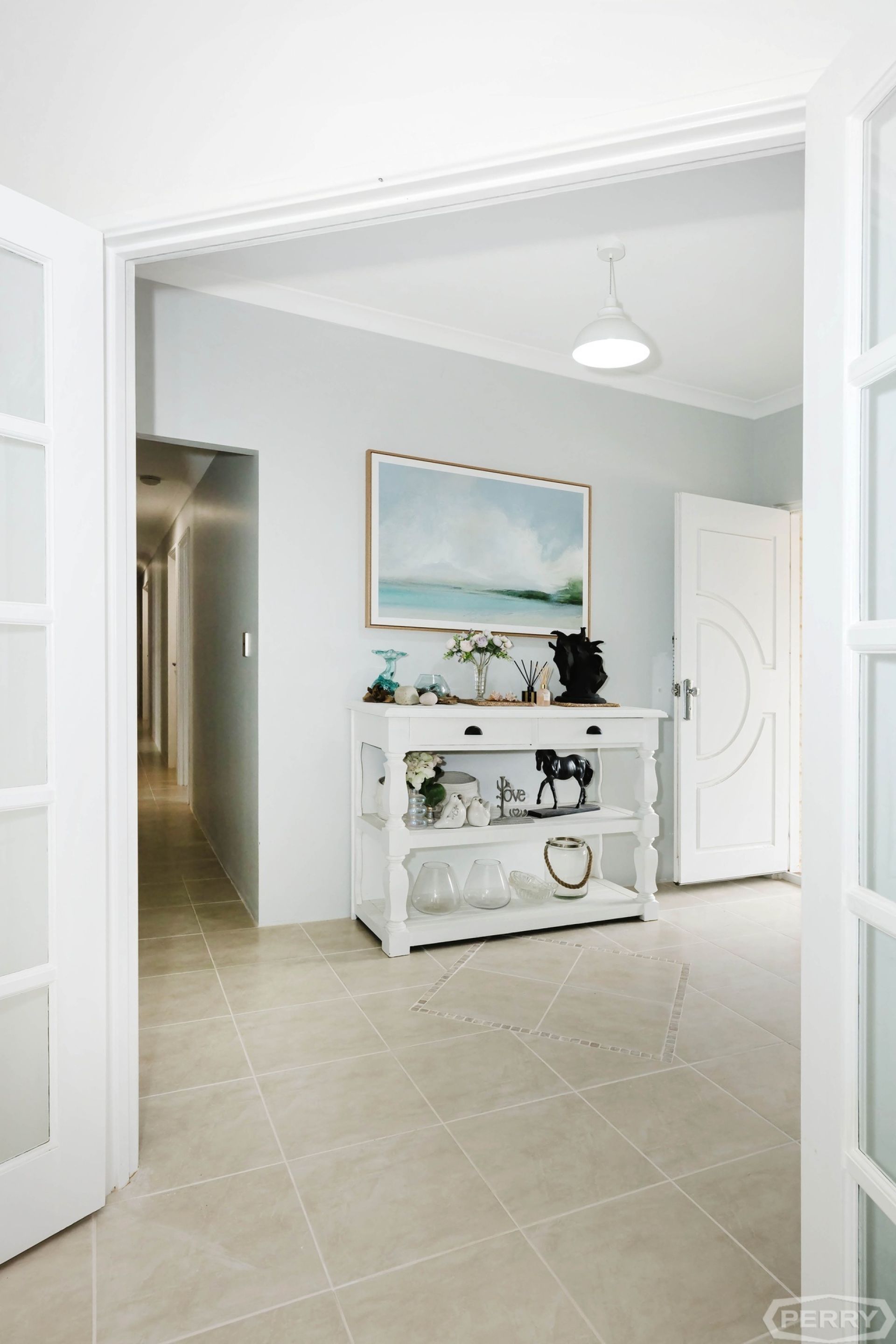 From the entrance hallway, through the French double doors, the house opens into an expansive open-plan living space, where soaring high ceilings coupled with tiled flooring of neutral tones provide the perfect setting for any style or flair.