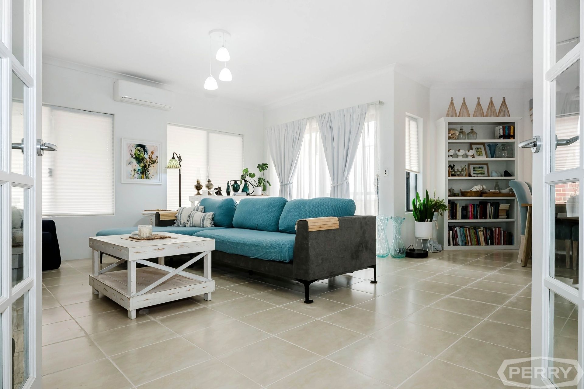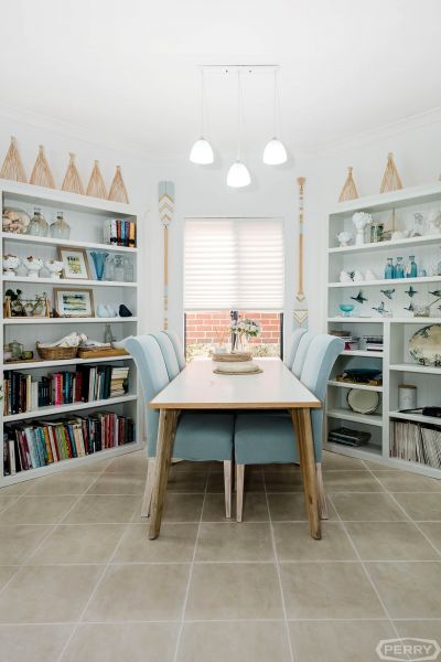 Coastal-inspired interior décor features pale blues & whites that are splashed throughout the house, with large windows adding to this property's vibrancy.